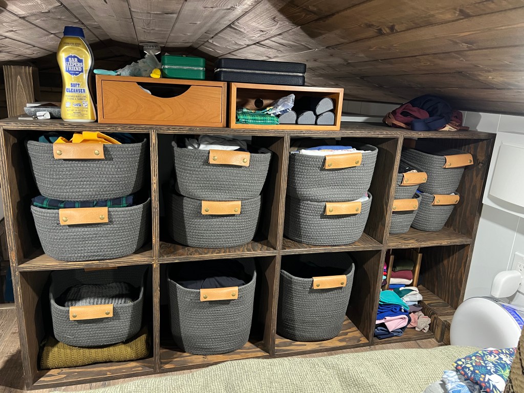 I haven’t been able to move around very well this week, as the more I moved the worse some of my symptoms were getting. But I did at least manage to finally organize my clothing storage in the sleeping loft! These are all simple rope baskets from Target. I’ve been a fan of them for quite some time, but I’ve never bought and dispatched this many before! I would like to add some color to them, though—I might try doing something clever like tassels or chunky embroidery from my extensive yarn stash. In any case, it looks so much tidier up there instead of all of the piles of clothes haphazardly exposed in the shelving. (I forgot to take a before photo!, but trust me on this.) And it will be easier to find what I’m looking for, too, now that categories of things are separated into themed baskets.