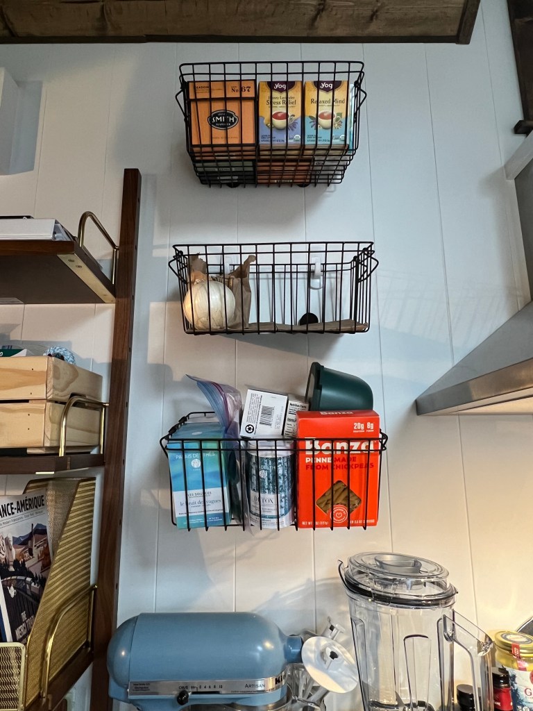 I have a few 3M hooks that have been doing heavy duty work in my bathroom and entryway, and I’ve decided I like where those ones are—they’ll be getting permanently installed hooks soon. But recently I also hung some metal wire baskets in my kitchen, for extra storage space, and I’ve decided I really dislike them there! With the bookshelves I’ve had installed in the living space, it’s just too much stuff on the wall altogether. So I think I’m going to rearrange other kitchen storage, so the items in the baskets can go in drawers, and I have a print that I’d like to get framed and put on the wall instead.