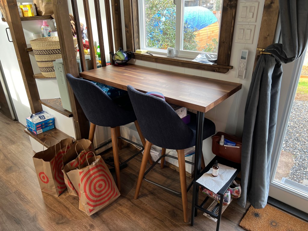 Small victory but exciting nonetheless: my dining bar is almost free of clutter! It’s been out of commission pretty much since I moved in because my ability to move about is so limited that it takes a very long time to get any organization project done, and there were a lot of things that just didn’t have homes yet, in boxes or bins or on shelves. I’m really excited to have another place to sit sometimes, even if it will just be for short bursts at the moment, since I’m even having trouble sitting upright for long periods of time right now. Remaining todos are to finish administering the collection of at-home medical tests sitting in one chair, and trying on a bunch of jeans I bought that have been patiently waiting in the other chair. (I would like to have a pair of jeans that feels ok to wear even when I feel like trash.)