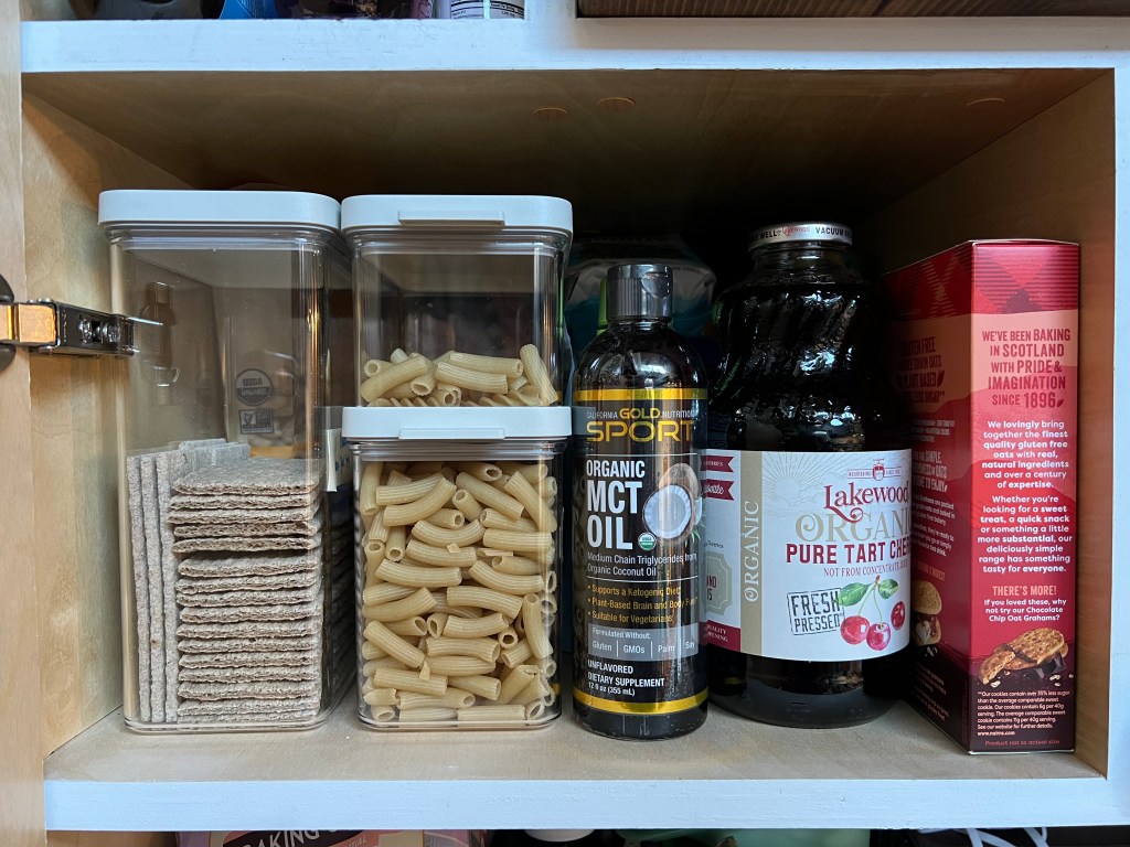 I’ve never been much of a “take things out of the container they came in just to put them in another container” person. I adore home organization shows but that particular strategy just seemed more work than benefit to me. But living in a tiny home that’s 236 sq. ft. means I need to optimize every cubic inch of storage space! I have a pantry cabinet under the stairs, but stacking a bunch of oddly-shaped items in there made it difficult to see what I have at any given time, and to easily access what I need. So I found some containers that are just about the perfect size! Unexpected new hobby of tiny home life: spending a lot of time looking at the exact listed dimensions of various products.