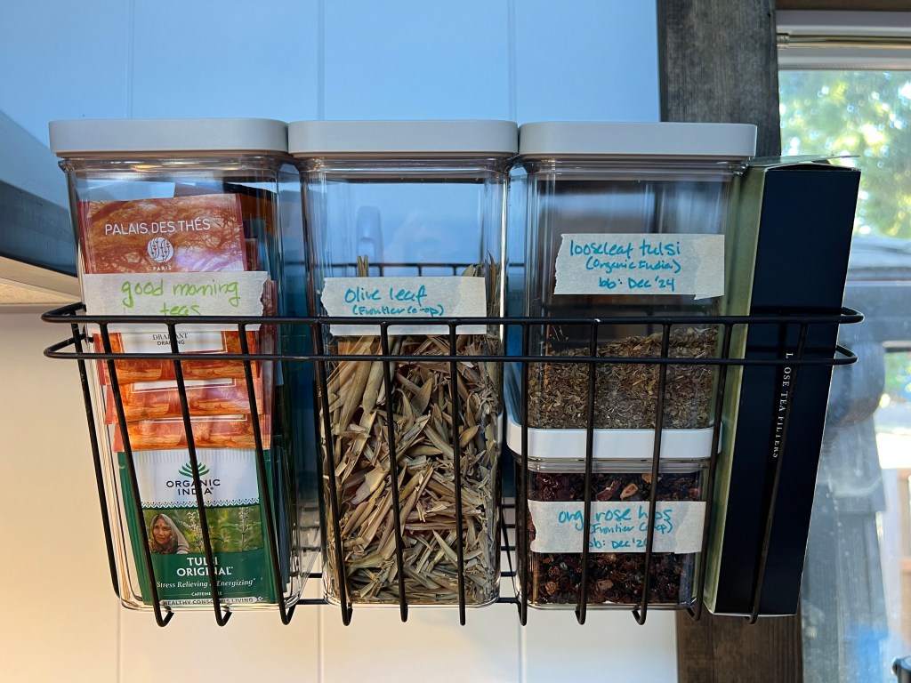 I ended up loving these containers so much that I got extra for organizing my tea baskets. (I’ve organized one of two tea baskets so far, I gotta buy more containers!) I like them both for storing loose leaf teas as well as tea bags from a bunch of different half-empty boxes—another way to optimize space in a tiny home kitchen. I think someday I may want to experiment with some sort of sliding shelf in my pantry cabinet, since it’s very deep and having to take everything out to get to the back is a pain. All in good time.
