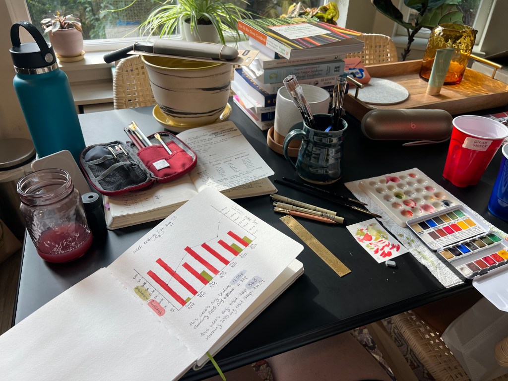 I also wanted there to be something…ritualistic about how I review my stats each week. So I dug out my watercolors and made a graph by hand. I had so much fun doing this. I know that like, sort of the point of watercolors is to be free in your painting. But I had a blast painting something with a concrete mathematical aim. This may become a habit.
